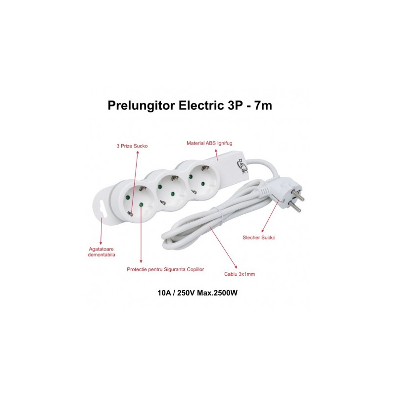 PRELUNGITOR ELECTRIC 3 PRIZE SI PROTECTIE COPII, CABLU 3X1MM / 7M