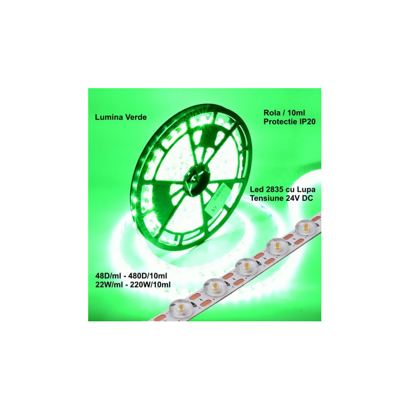 BANDA LED 2835 CU LUPA - 24V - 480LED - 220W, IP20 LUMINA VERDE, ROLA/10ML