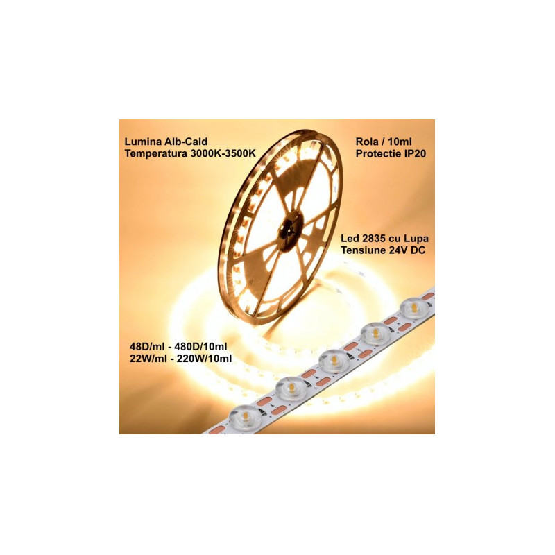 BANDA LED 2835 CU LUPA - 24V - 480LED - 220W, IP20 LUMINA ALB-CALD 3500K, ROLA/10ML