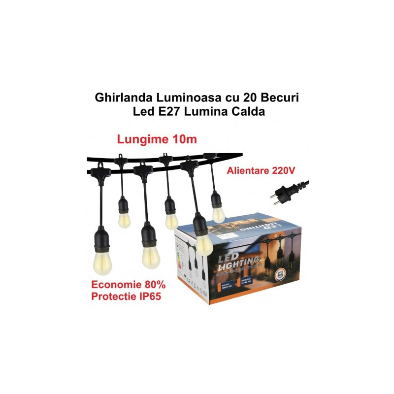 Ghirlanda Luminoasa 10 metri cu 20 Becuri Led E27 Lumina Calda, Alimentare 220V