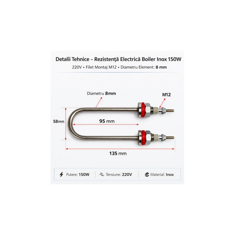 Rezistenta Boiler Inox 150W 220V Filet M12 Element 8mm Tip U,